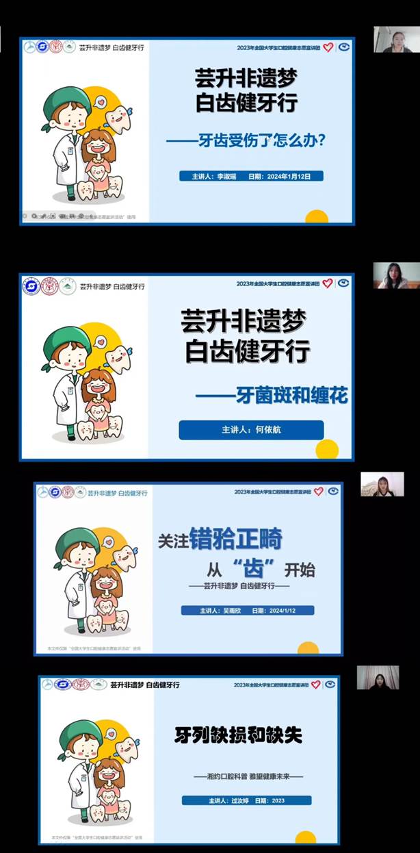 此次活动线上联合宣讲开展了七次,受益者累计972人次;线下宣讲开展了两次,受益者累积100人;线下联合宣传受益者预计达到500人。本次活动受益者累计达到了1572人。服务对象包括保安大叔、超市售货员、居民、大学生、高中生、初中生等,其中95%的人表示对口腔健康有了更深入的了解。通过非遗文化的展示,成功激发了大家对传统文化的兴趣和尊重。即使是线上讲座,同学们也积极活跃,纷纷发送弹幕互动,气氛热烈,参与度较高,达到了我们预期的宣传效果。