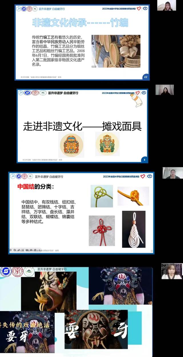 悠悠岁月,千载文明,我们身处的世界充满了无数珍贵的非物质文化遗产。这些非遗,既是历史的见证,也是人类智慧的结晶。我们将口腔健康与非遗相结合,为同学们展现出一个别样的护齿世界。宣讲的末尾,我们展示了具有地方特色的非物质文化遗产,如剪纸、团扇、缠花、泥塑、耍牙、脸谱、竹编、中国结、傩戏面具等,并且我们团队成员以极其生动的图画视频展现了剪纸工艺,一把剪刀,一张纸,描绘出一幅幅精彩绝伦的画面;团扇贯穿中国历史几千年,其制作工艺相当复杂,展现了中国古人的智慧;中国结作为中国文化的象征,向世界展现了中华民族爱好和平,勤劳团结的高尚美德……通过这些手工艺品的展示与体验,让大家感受传统文化的魅力。