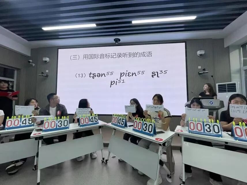 决赛题型多样,形式灵活,集知识性、趣味性和应用性于一体。比赛以中华成语、古典诗词、现当代诗文为载体,通过听词记音、看图识音、语境辨音和看音标写词句、读诗文等多种形式,全方位考查选手国际音标掌握的精准度、熟练度和实际应用能力。比赛分为两个阶段:第一阶段为淘汰赛,采用必答题形式,选手需在规定时间内将答案书写于答题板上,由评委老师现场评判正误。经过激烈角逐,12名选手成功晋级总决赛。第二阶段为总决赛,包含必答题与抢答题两个环节,抢答题的国际音标知识竞答和读国际音标连诗文语句两类题目将整个比赛推向高潮,选手们的精彩表现赢得现场观众的阵阵掌声。