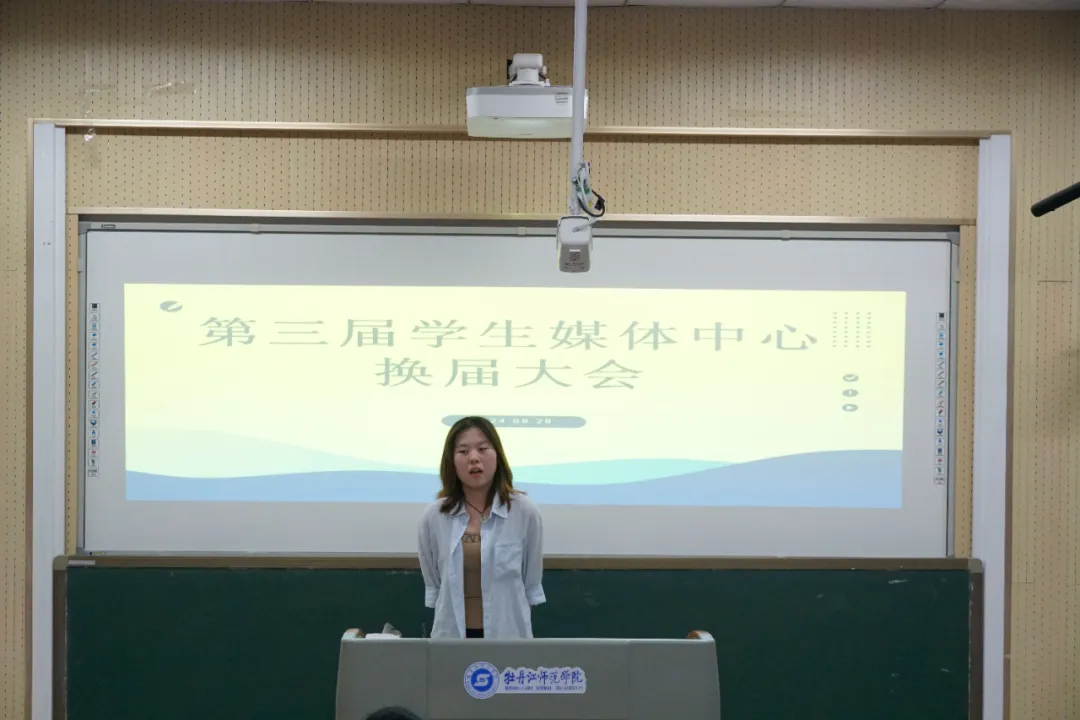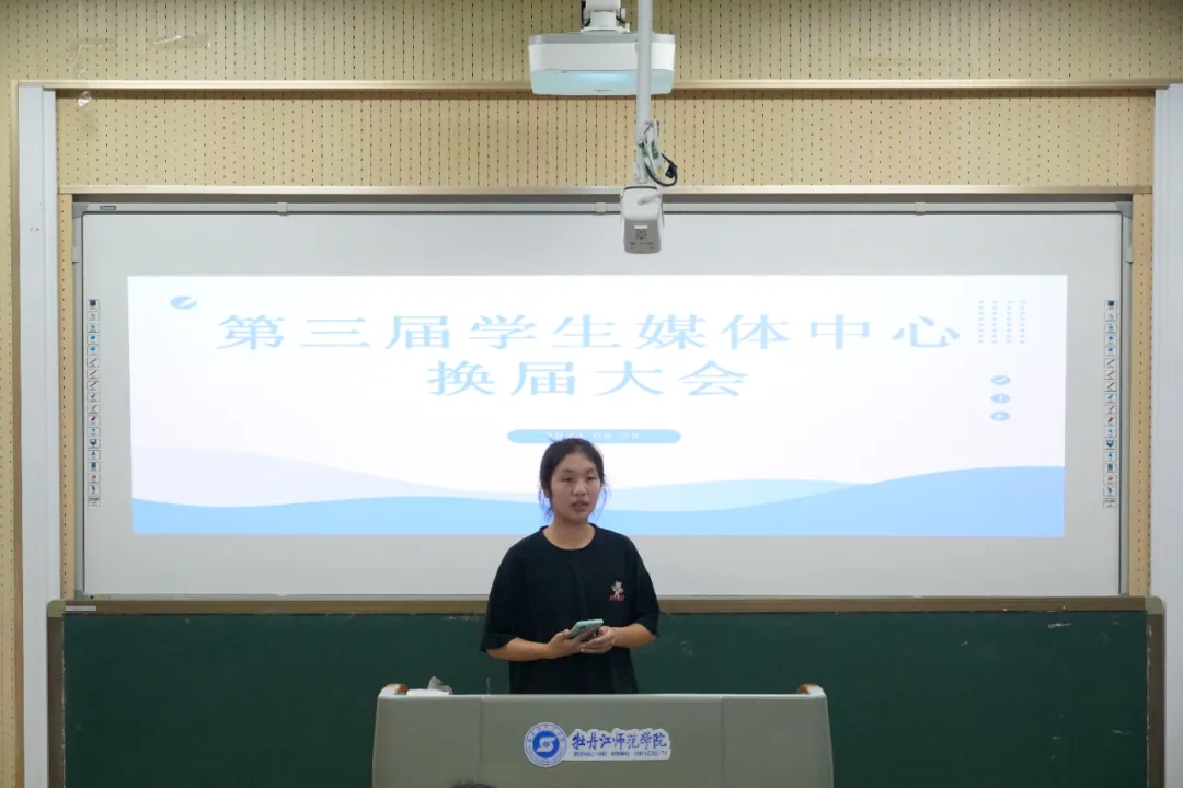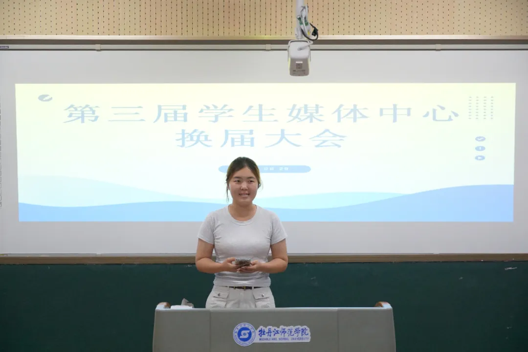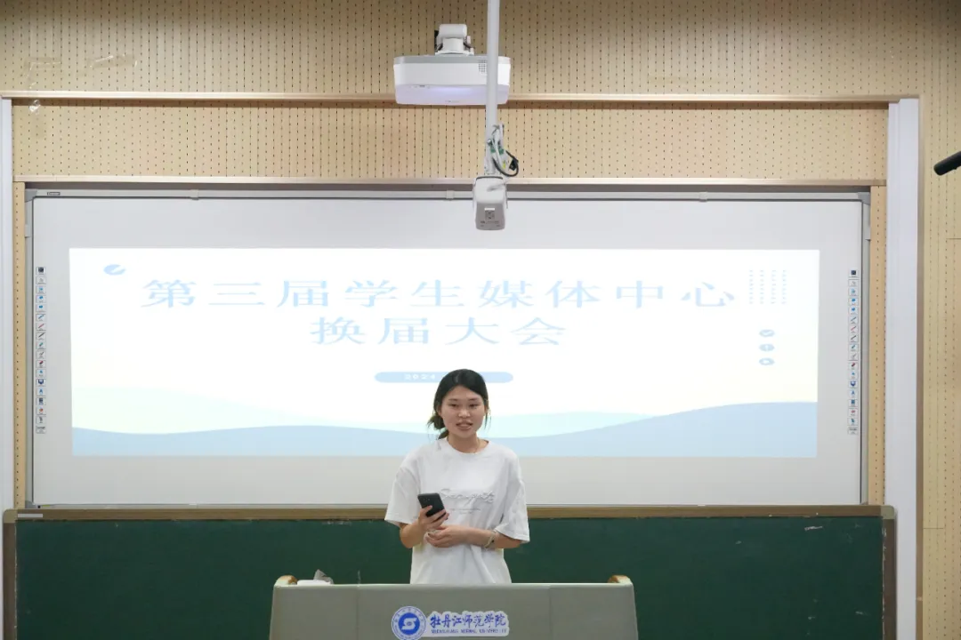 会议第一项议程,主任程龄萱作年度工作报告。她总结过去一年里学生媒体中心开展的相关工作,对老师们在工作中的指导与包容表示感谢,也对各位干事的工作成果表示肯定,同时希望新一届成员能够继续立足本职岗位完成各项任务。