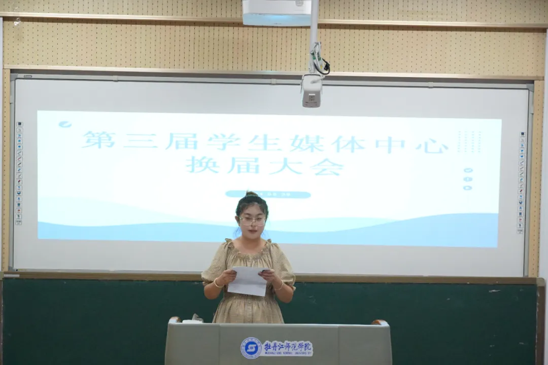 会议第二项议程,指导老师张东影发言,并为第二届学媒主任团、部长、副部长颁发聘书。她对第二届学生媒体中心全体成员夜以继日的努力表示充分肯定,希望下一届学生媒体中心成员能够勇担重任,接过前辈的接力棒,继续发扬学生媒体中心的优良传统,以更饱满的热情投入到工作当中。