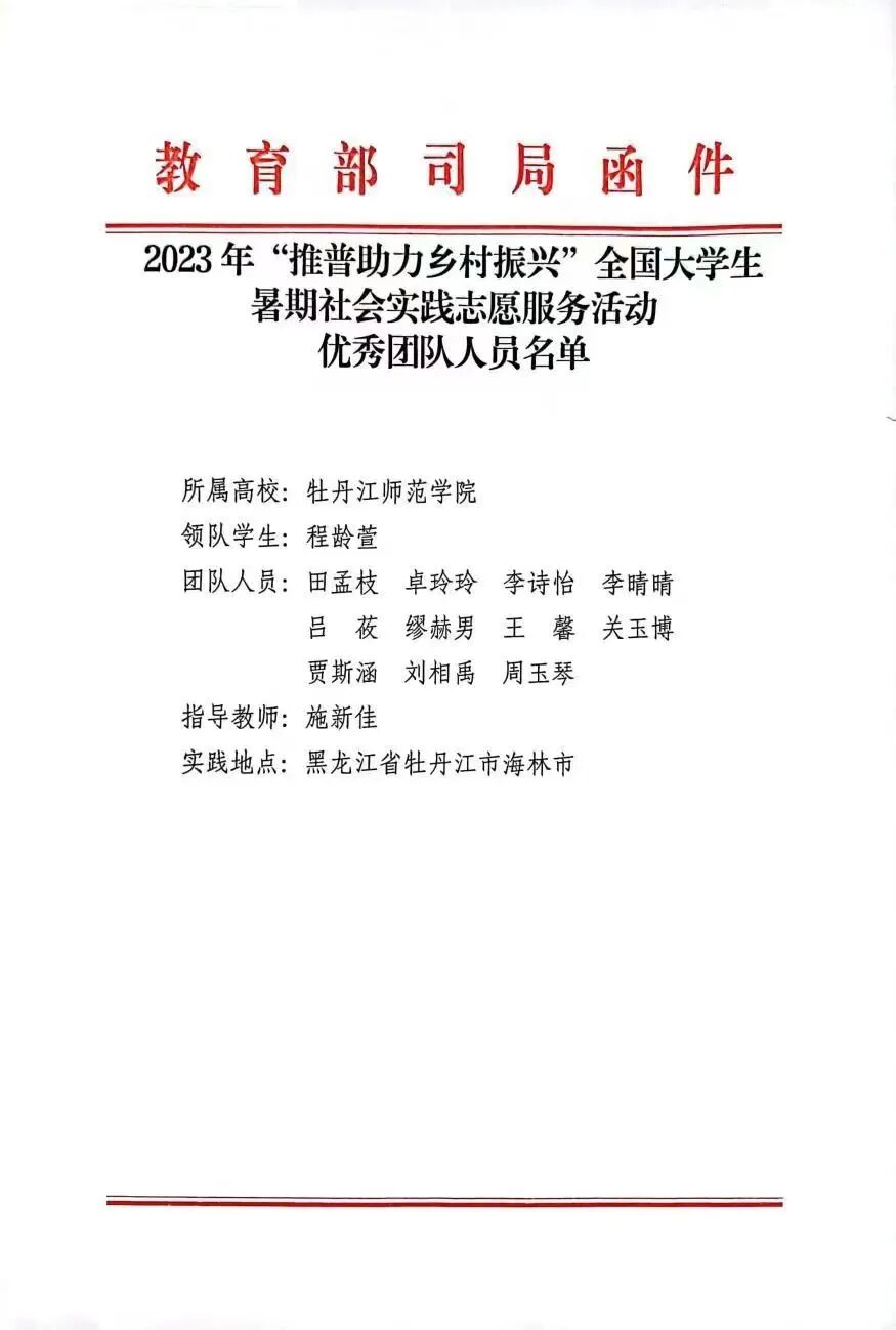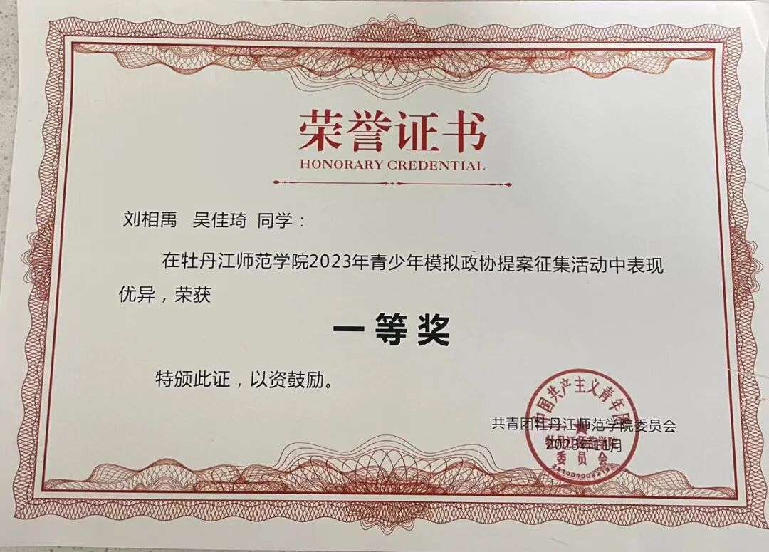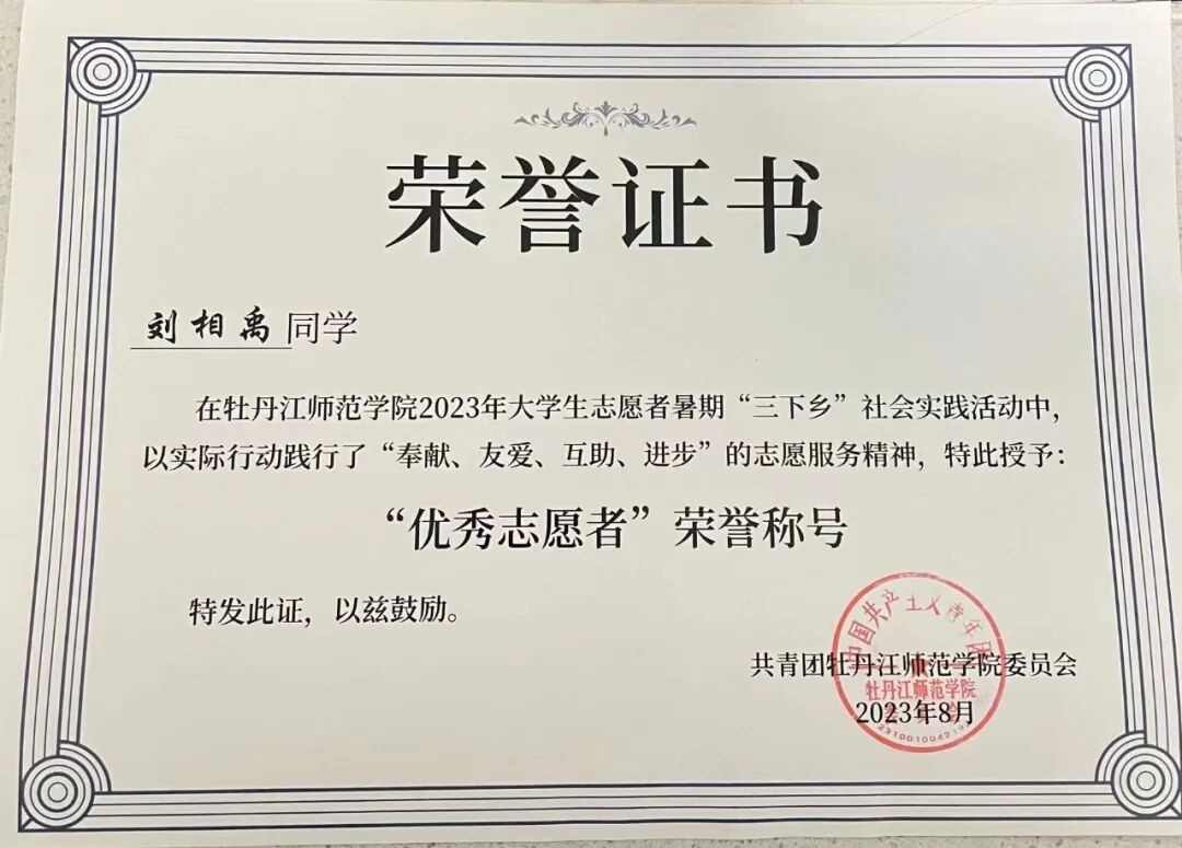 社会给了我上升的通道,我必要以实际行动回报社会。大学期间我积极参与社区志愿活动,“益起行动·节约粮食”公益活动。2023年暑期我作为牡丹江师范学院文学院推普实践队的一员,用实际行动为队伍做出贡献,荣获“优秀志愿者”称号,且所在团队成功获得“优秀团队”并受到教育部语用司及团中央青发部来信表扬。同时,我也获得了牡丹江师范学院青少年模拟政协提案活动一等奖,在提案过程中展开实地调研,保持参加民主协商的热情和意识,为国家发展献计献策,以青春之笔讲好中国故事。