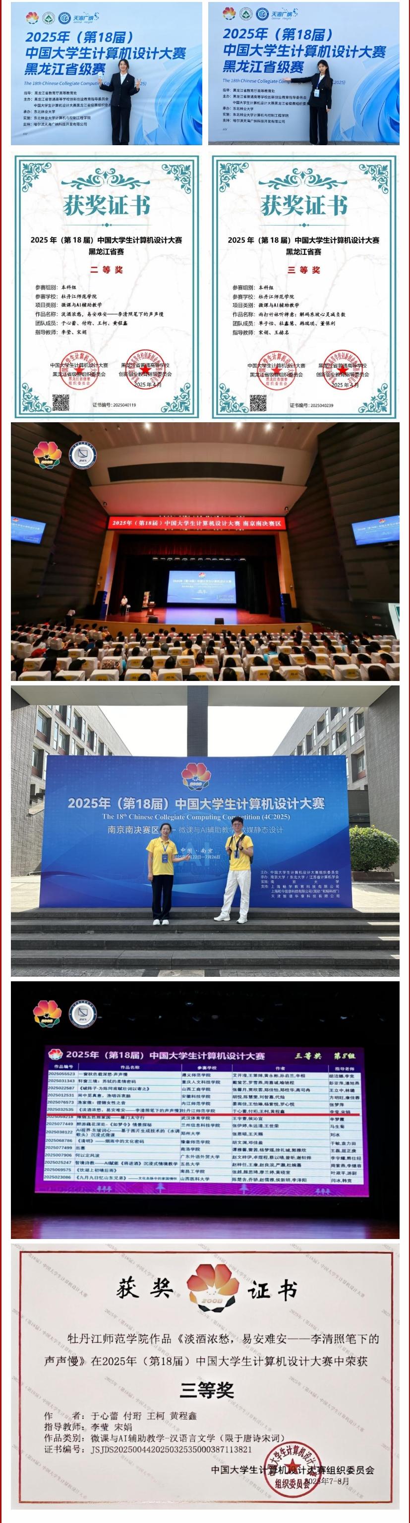 自赛事启动以来,文学院参赛学生在宋娟、李莹等指导教师的悉心指导下全身心投入备赛,反复打磨作品、优化方案。申报的两部作品成功晋级省级赛事,其中作品《淡酒浓愁 易安难安——李清照笔下的声声慢》斩获省级二等奖、作品《雨打竹林听禅意:解码东坡心灵减负术》斩获省级三等奖;作品《淡酒浓愁 易安难安——李清照笔下的声声慢》入选国赛,并最终斩获国赛三等奖。
