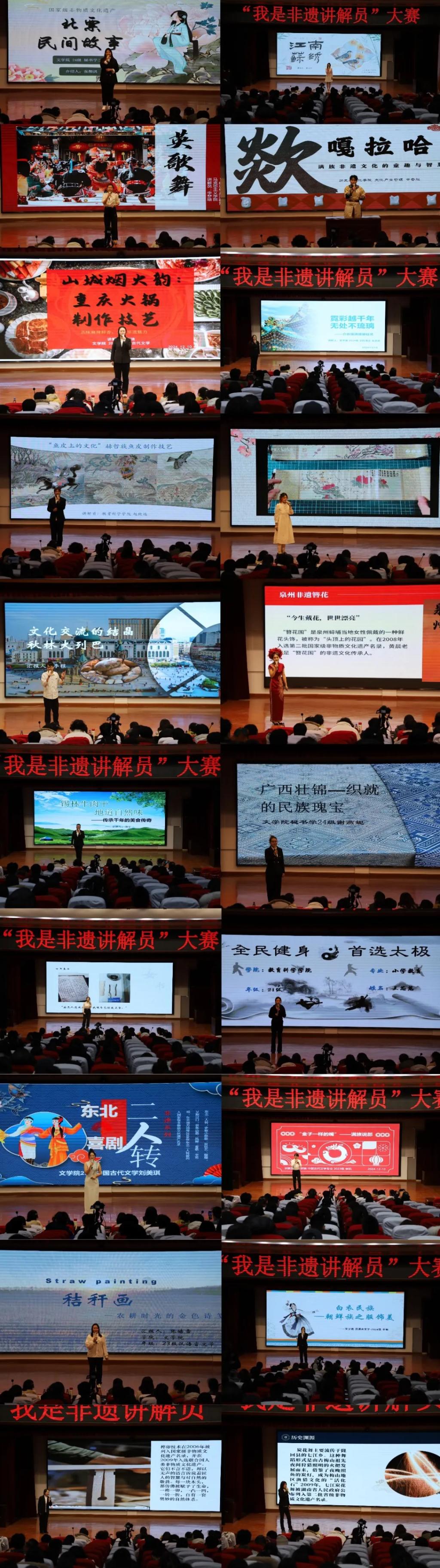 活动的第二项内容是牡丹江师范学院第一届“我是非遗讲解员”大赛决赛。本次大赛全校研究生、本科生积极响应、踊跃参与,12月5日进行了大赛初赛,择优选拔20名选手进入决赛。20名参赛选手所讲解的内容均为入选国家、省、市、县四级非遗名录的项目,讲解内容涵盖广泛,包括满族说部、北票民间故事、英歌(潮阳英歌)、七江炭花舞、东北二人转、望都传统木工技艺(榫卯结构技术)、赫哲族鱼皮制作技艺、龙麟装技艺、重庆火锅、秋林大面包(大列巴)制作技艺、琉璃烧制技艺、炭烤牛肉干制作技艺、壮族织锦技艺、满族歘嘎拉哈、太极拳(陈氏太极拳)、苏绣、麦秸工艺(秸秆画技艺)、朝鲜族服饰、女书习俗、蟳埔女习俗等,涉及民间文学、传统舞蹈、曲艺、传统技艺、传统体育、游艺与杂技、传统美术、民俗等多个类别。选题视角也丰富多样,从自身民族文化视角选题,从自身家乡文化视角选题,从自身兴趣爱好视角选题,更多学生从龙江特色文化视角选题,充分展现了大学生对于中华优秀传统文化的热爱和保护传承文化的意识。